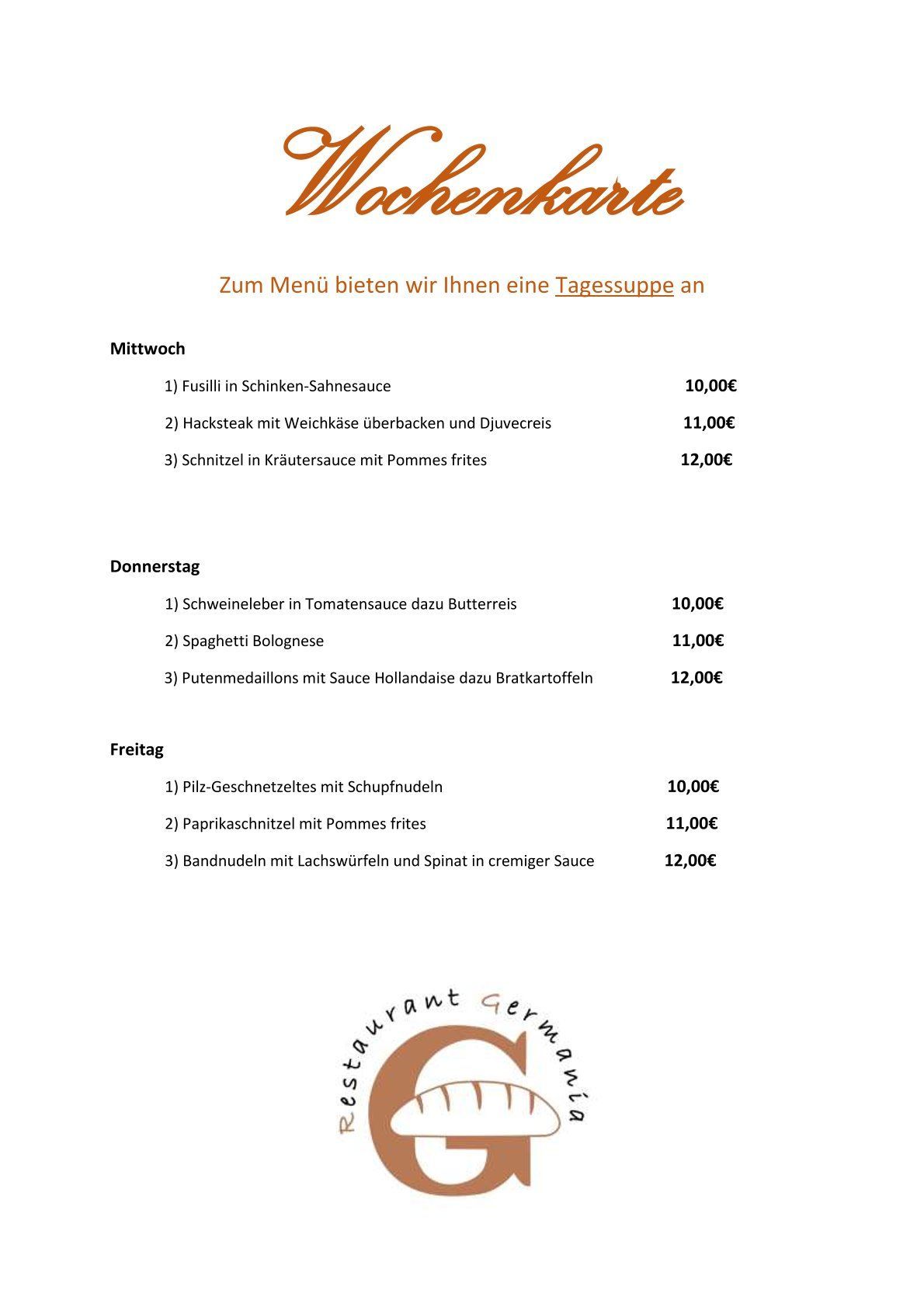 Mittwoch: 11:30-14:30 Uhr (warme Küche 14:00 Uhr)